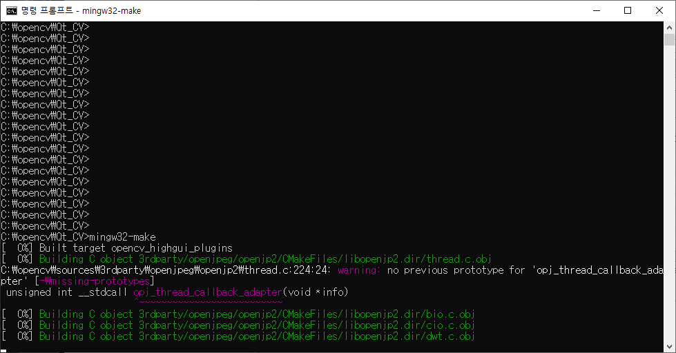 cmd : cd C:\opencv\Qt_CV\mingw32-make -j 4